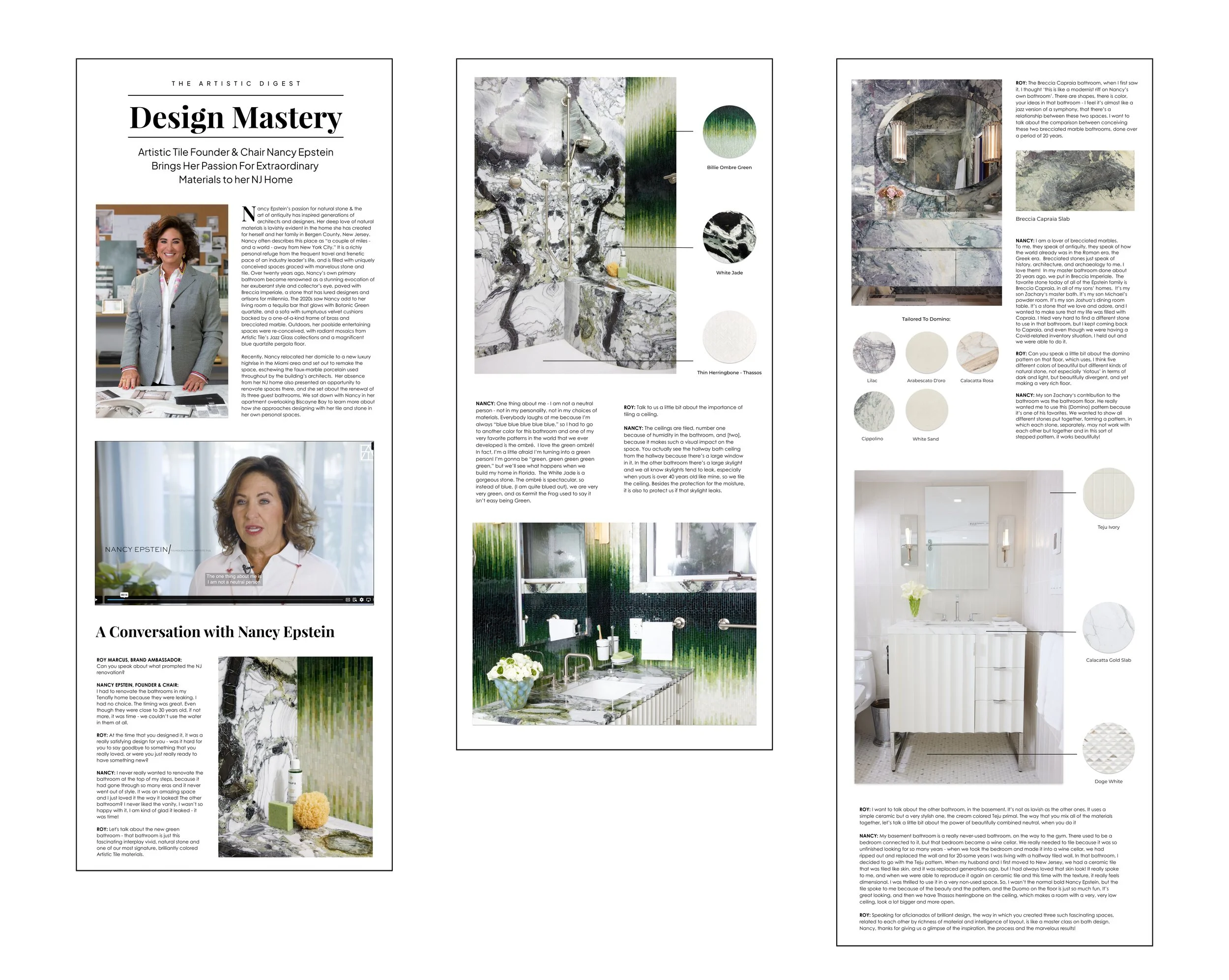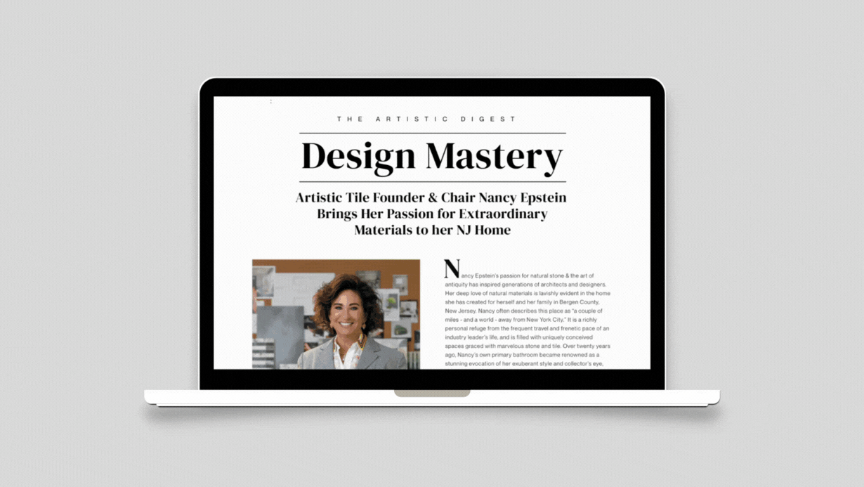 This is a Artistic Digest landing page showing Artistic Tile Founder & Chair Nancy Epstein brings her passion for extraordinary materials to her New Jersey home.
