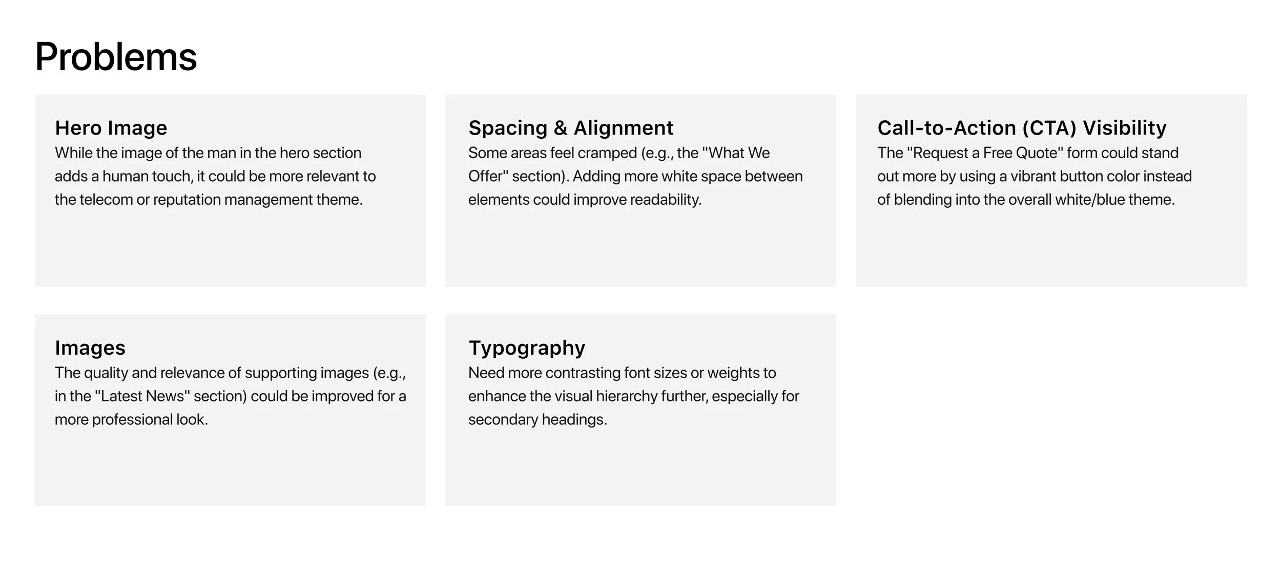 The previous website was outdated in terms of color scheme and layout, making it difficult to effectively convey the intended message and information. Additionally, important text was often overlooked due to poor text segmentation and the lack of high-resolution images that could visually support the information being presented to customers.