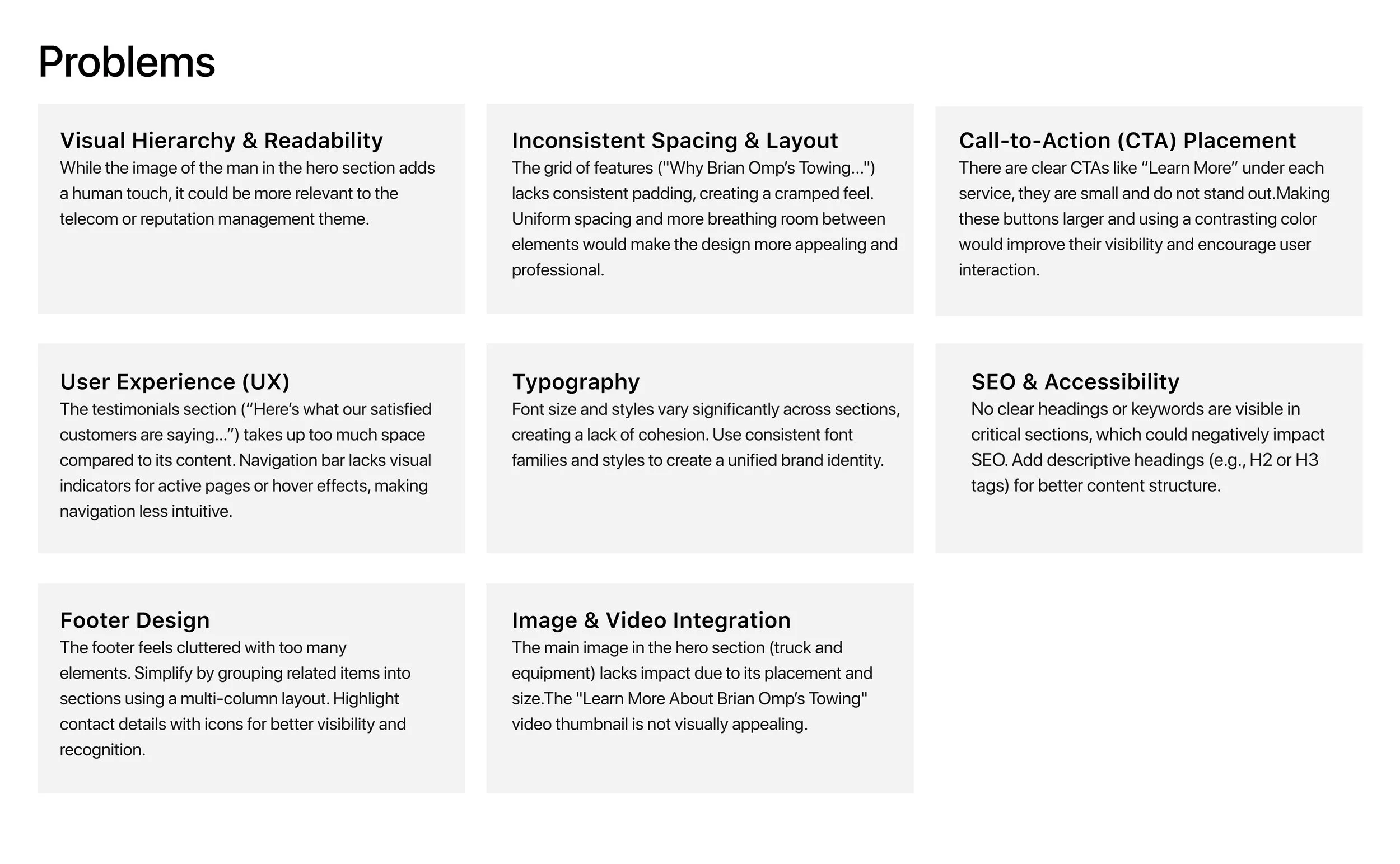 I redesigned the website for Brian Omp's Towing & Repair, transforming their outdated platform into a modern, user-friendly interface. My responsibilities included addressing and resolving issues with the old template, enhancing functionality, and updating the visual design to align with current web standards.
