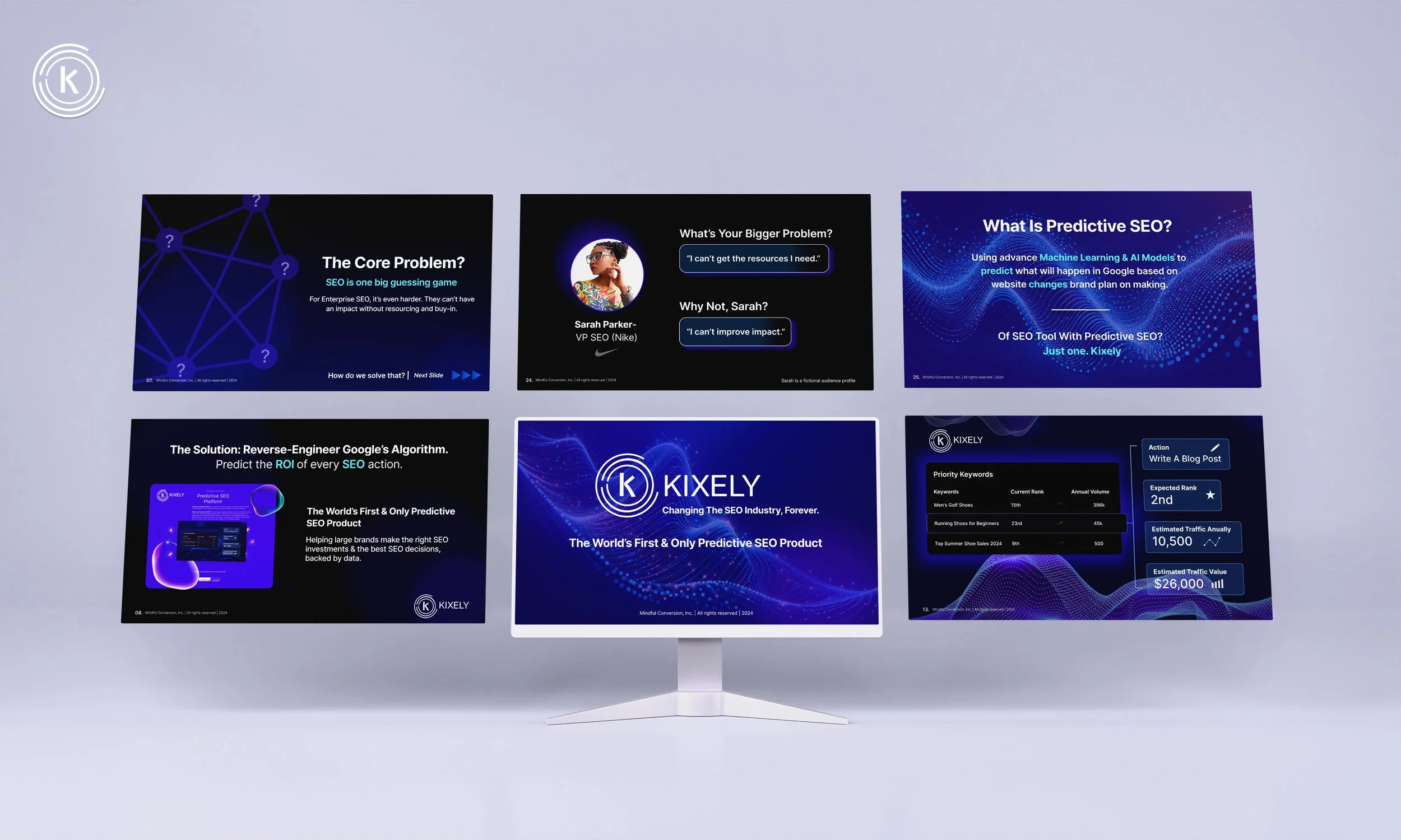 Crafted visually engaging digital displays for Kixely's website, enhancing their brand presence and user experience. Kixely is the world's first predictive SEO product, empowering brands to forecast SEO outcomes based on website actions. Additionally, contributed to the design of a presentation showcasing their innovative approach. Feel free to view the presentation!